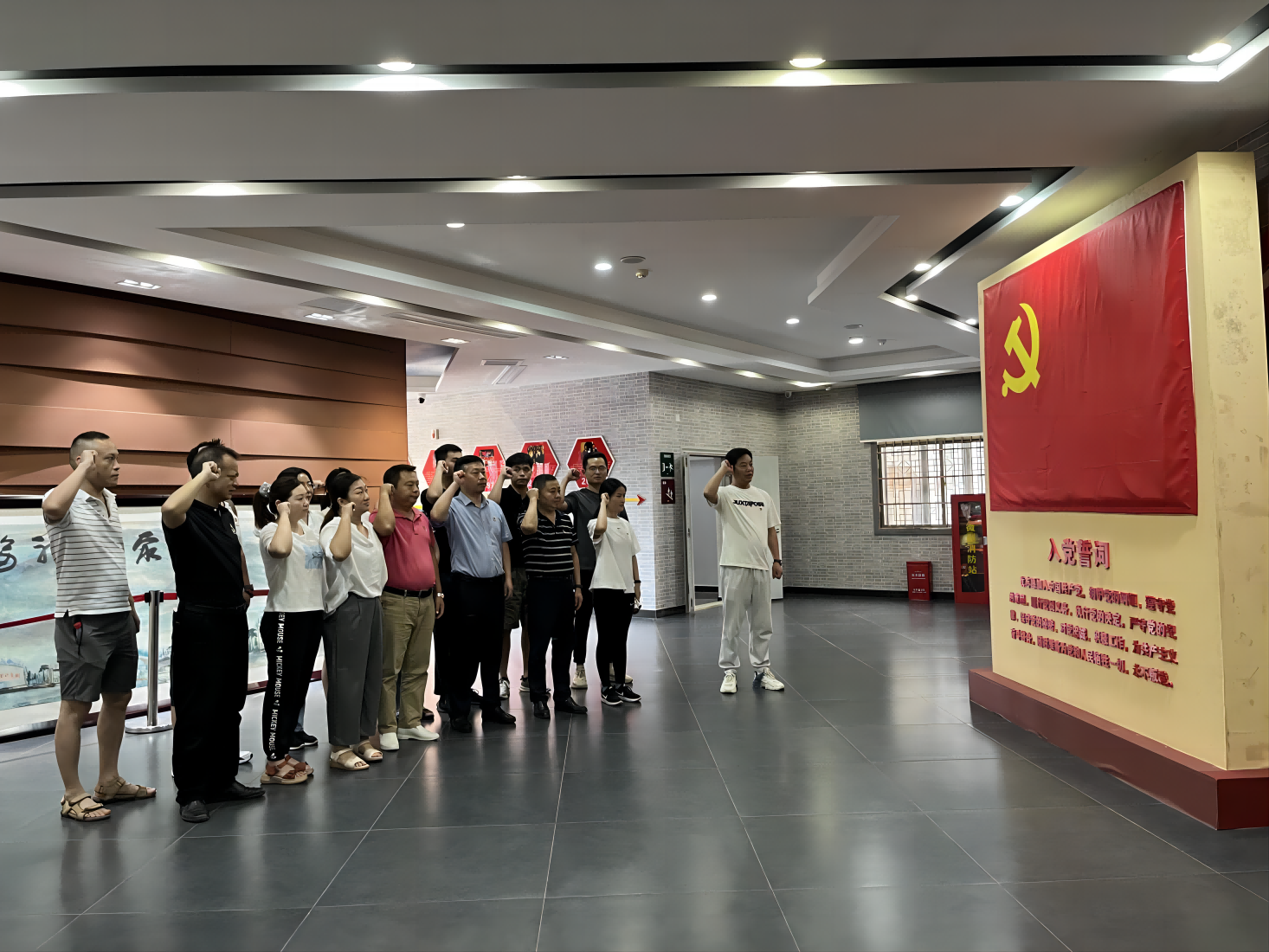 天朗氣清,惠風和暢。在8月5日上午十點,全體黨員同志、入黨積極分子代表來到武漢抗戰第一村---姚家山新四軍第五師舊址紅色教育基地。面對鮮紅的黨旗,黨員們一起重溫入黨誓詞。“我志愿加入中國共產黨,擁護黨的綱領,遵守黨的章程……永不叛黨。”錚錚誓言響徹大地。重溫入黨誓詞,既是是初心使命的再宣示、更是接續奮斗的再出發。