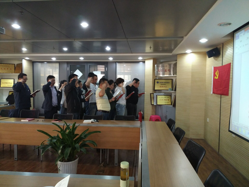 會議伊始,全體黨員在黨支部書記陳建濤同志的帶領下,由黨支部委員丁劍輝同志領誓,全體黨員重溫入黨誓詞,黨員們面對黨旗,舉起右手,莊嚴宣誓: 我志愿加入中國共產黨,擁護黨的綱領,遵守黨的章程,履行黨員義務,執行黨的決定,嚴守黨的紀律,保守黨的秘密,對黨忠誠,積極工作,為共產主義奮斗終身,隨時準備為黨和人民犧牲一切,永不叛黨。